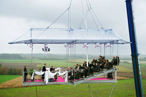 Makan malam di udara mulai diperkenalkan di Eropa dan beberapa ada di USA. Restoran yang megah sekaligus portable ini melayani makan malam dengan meja, kursi, dan perlengkapan lainnya yang digantung di ketinggian 165 kaki di udara. Kursi-kursinya sendiri bisa berputar 180 derajat. Restoran ini digantung oleh crane berkekuatan 90 hingga 160 ton dengan kapasitas maksimum untuk 22 orang atau maks 5000 kg plus para pramusaji, koki, dan tentu saja hiburannya. Paket makan malam di langit ini berdurasi 8 jam dan biayanya sekitar 11.400 pounds, tanpa fasilitas catering. Beuh...